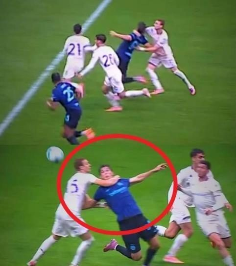 本赛季意甲第10轮,国米客场2比1绝杀维罗纳的比赛中。在这粒幸运乌龙绝杀2分钟前,国米通过前场配合,成功将球送到皮奥埃斯波西托脚下,国米小将随即强势突入维罗纳禁区内,正当他准备射门之际,维罗纳补防的后卫贝拉科沙明显在自家禁区内伸手拉倒皮奥,这样一个明显犯规动作,主裁判居然毫无表示,蓝黑军团就这样再次无缘点球。
